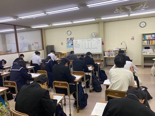 全県模試も第6回を迎え、入試本番の難易度により近づいた問題に、生徒たちは真剣に取り組んでいました。教室内には緊張感が漂い、時折聞こえるページをめくる音と鉛筆を走らせる音だけが、静寂を破るような集中した環境でした。